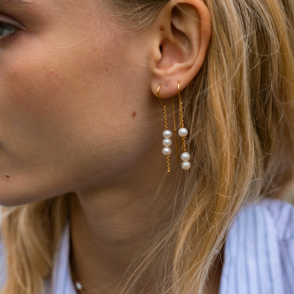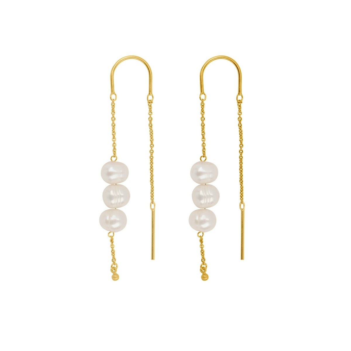Emily Strings øreringene er designet til at imponere med deres lette og luftige udtryk. De gyldne kæder, der elegant holder hver perle, skaber en illusion af, at perlerne svæver, hvilket tilfører et strejf af sofistikeret skønhed. Den varme guldtoning i det forgyldte sølv eller den klassiske glans af sterlingsølvet harmonerer smukt med de bløde, hvide nuancer af perlerne og skaber en elegant balance.