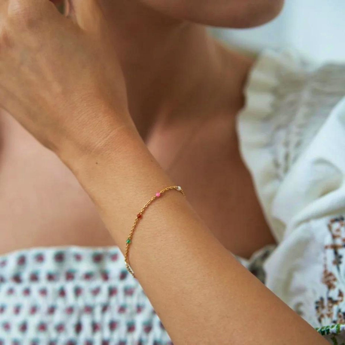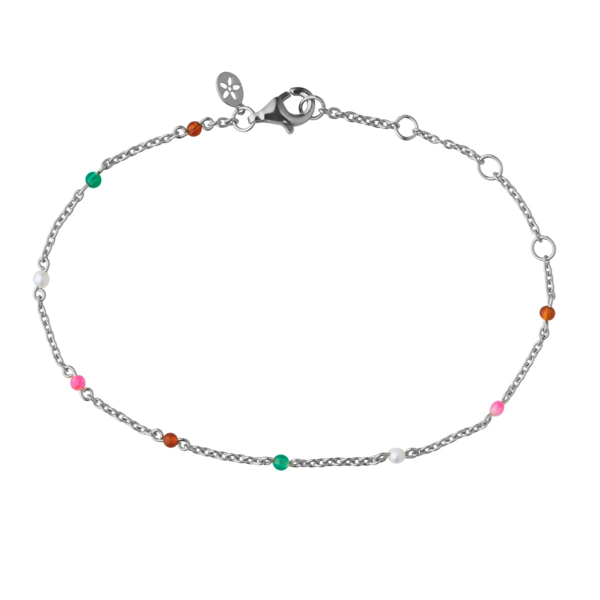 Armbåndet prydes af livlige perler i ferskvandsperler, rød agat, grøn agat og lyserød jade, der tilfører en personlig og farverig dimension til dit outfit. De små perler er jævnt fordelt langs den skinnende kæde, hvilket skaber en harmonisk balance mellem farver og det luksuriøse metal.