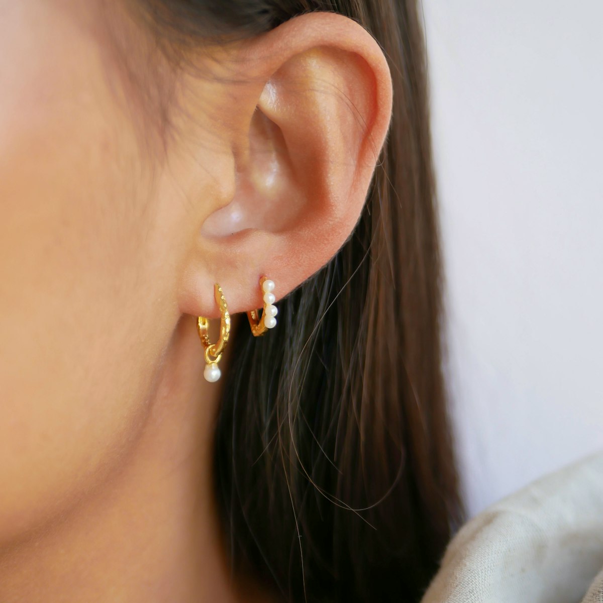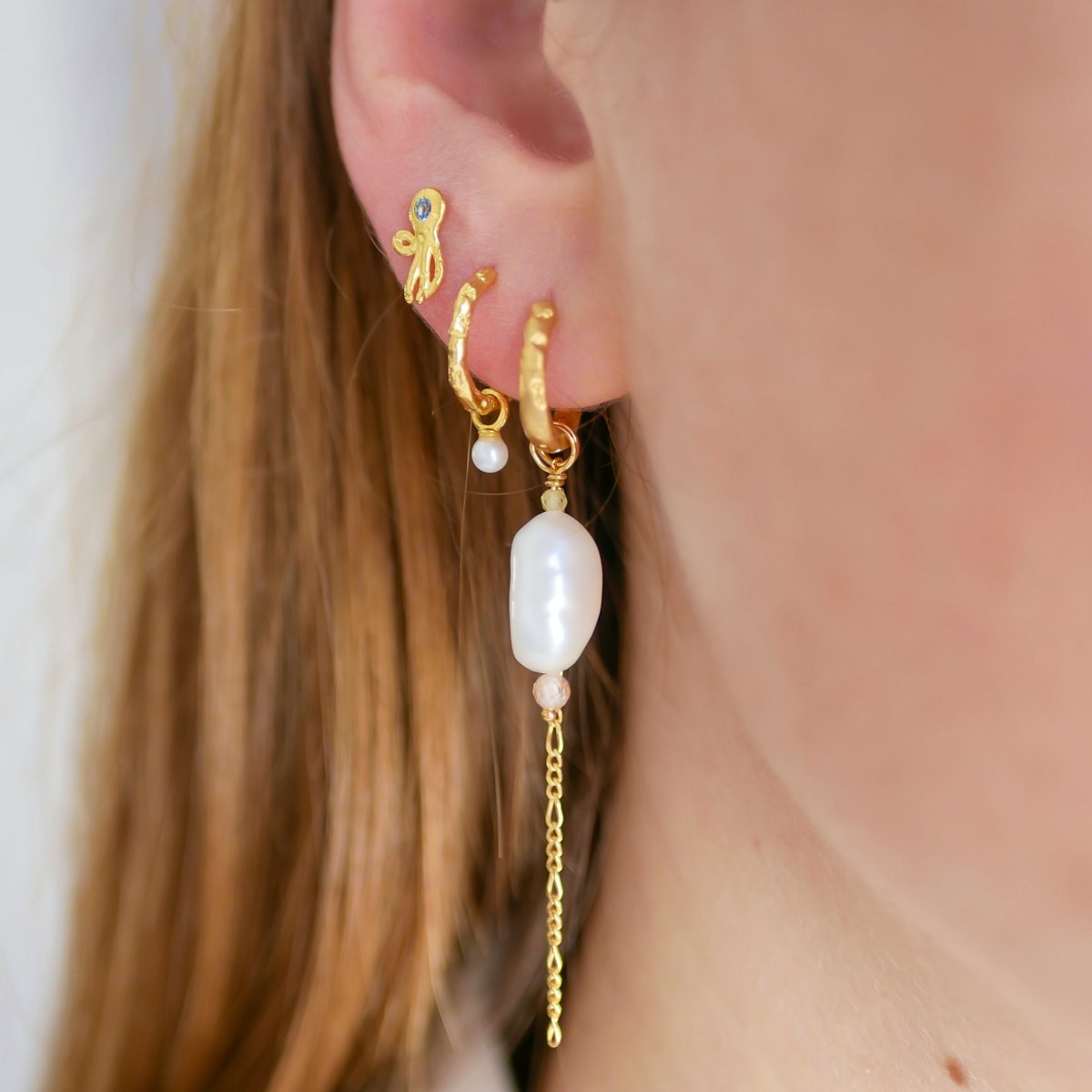 Enamel Copenhagens Belle hoop er en klassisk lille hoop ørering med et råt tvist. Vi er vilde med den elegante perle, der står i skarp kontrast til den grove hoop. Perlevedhænget kan tages af efter behov, hvorfor du har to i én ørering. Herved har du også en helt ren cool hoop. Den eksklusive og dog simple perle-hoop passer til de fleste af dine andre ENAMEL Copenhagen smykker.