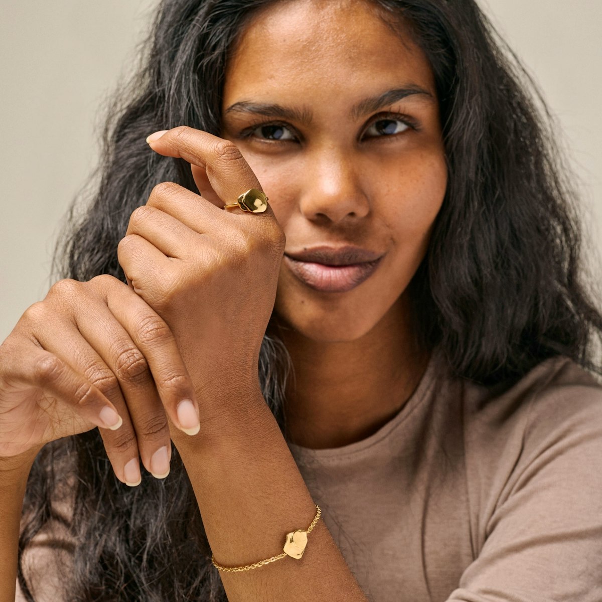 Pendanten på Sahara-armbåndet er et raffineret design, der består af to overlappende plader, hvilket skaber en imponerende dybde og en unik æstetik. De overlappende guldfarvede plader er inspireret af de bølgende sandbanker og de naturlige formationer i den majestætiske Sahara-ørken, hvilket giver smykket en subtil men markant reference til naturens skønhed.