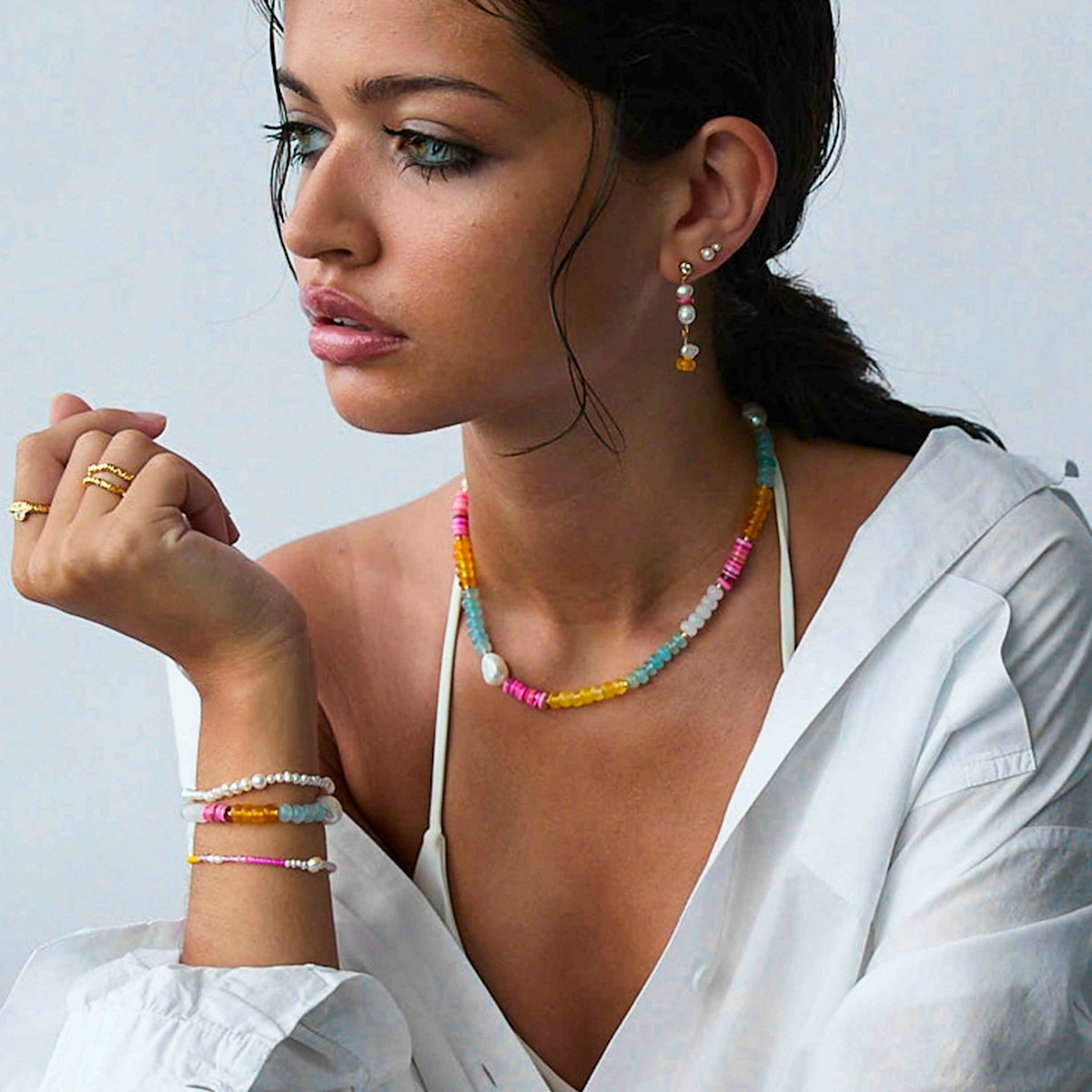 Indfang sommerens og strandens stemning med dette håndlavede armbånd i 18 karat forgyldt sterlingsølv. Med ferskvandsperler samt perler i koralfarve, og nuancer af gult, blåt og pink, skabes et armbånd, der passer perfekt til festivaler og solrige dage på stranden. Længde: 16,6 cm + 3 cm fleksibel justering.
