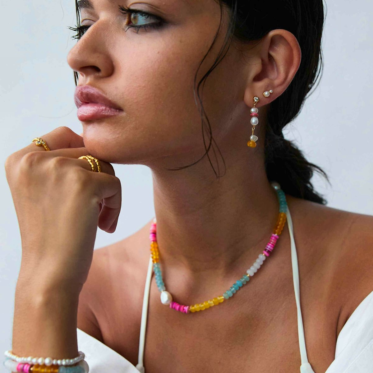 Fang sommerens og strandens essens med disse smukke håndlavede øreringe i 18 karat forgyldt sterlingsølv. Ferskvandsperler, koralfarvede perler og perler i gult, blåt og pink skaber et armbånd perfekt til festivaler og solrige stranddage. Længde: 3,5 cm.