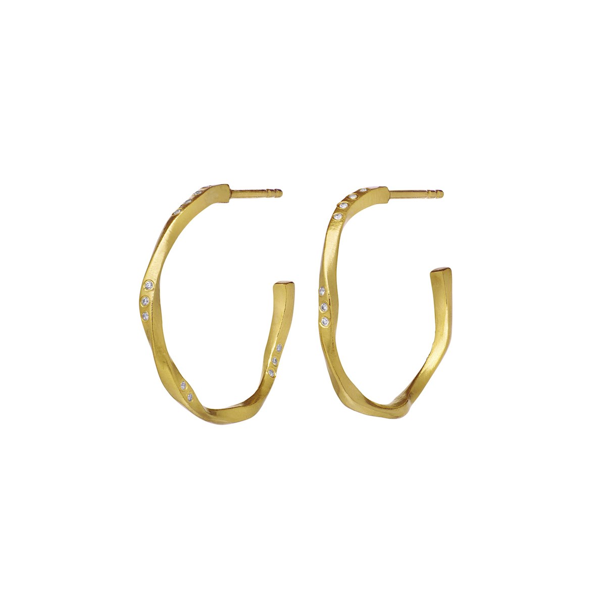 Et twistet design med skinnende zirkoner nyfortolker den klassiske hoop-ørering. Echo-øreringene findes i tre forskellige størrelser og er i Maanestens A/W 23-kollektion skabt som en hyldest til naturens organiske former, en af kollektionens store inspirationskilder.