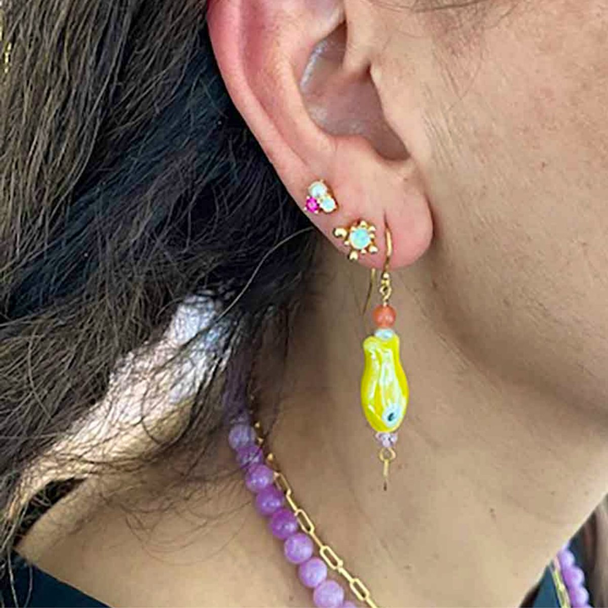 Chaque détail de Livi a été choisi avec un clin d'œil. Des figures amusantes en céramique, des perles douces, de petits zircons cubiques étincelants et de véritables perles d'eau douce forment un charmant mélange. Les deux boucles d'oreilles sont assorties l'une à l'autre sans être identiques, et c'est ce qui les rend si amusantes. L'une est dans les tons jaunes et roses, tandis que l'autre est d'un rose et d'un violet un peu plus discrets. Elles sont sœurs, pas jumelles. Et c'est ce qui les rend si spéciales.