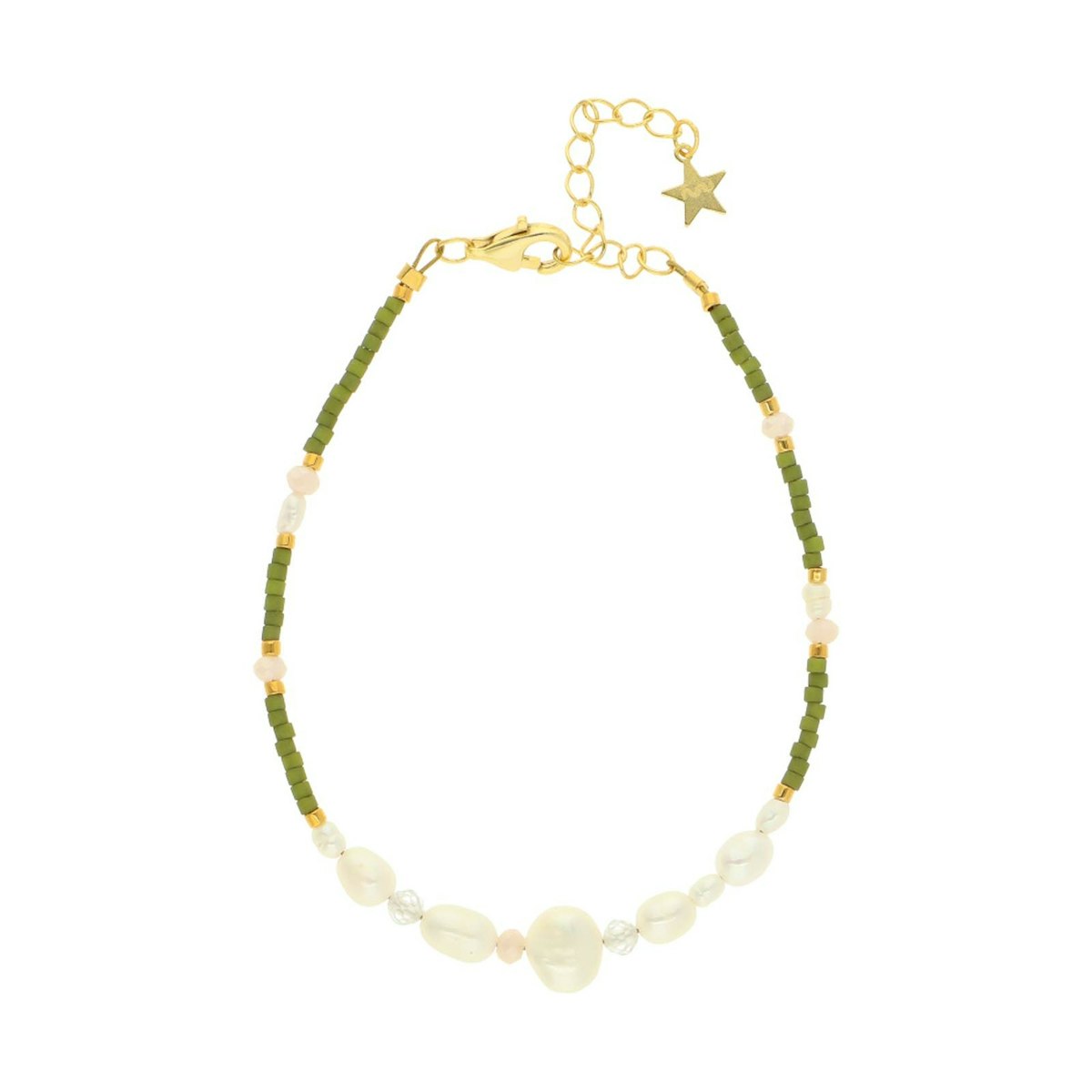Merle Dusty Green Bracelet fra Nuni Copenhagen er et håndlavet perlearmbånd i 24 karat forgyldt genanvendt sterlingsølv 925, smukt sammensat med glasperler, ferskvandsperler, halvædelsten og zirkonia. De støvede grønne nuancer giver armbåndet et roligt og harmonisk udtryk, mens de små funklende detaljer og ægte perler tilfører dybde og eksklusivitet. Det er et smykke med karakter og balance – perfekt til dig, der elsker smykker med både farve og finesse.