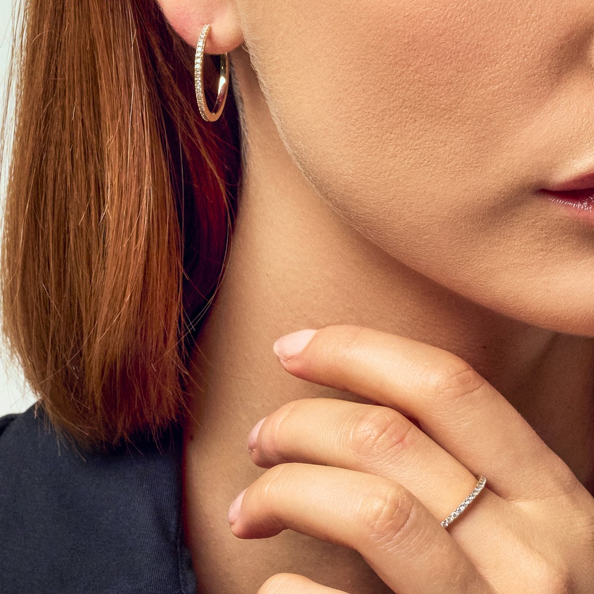 Avec un anneau de 25 mm, la boucle d'oreille a un aspect équilibré et aéré qui permet à la fois l'élégance et le style personnel. Le design poli et simple met en valeur la beauté naturelle des diamants, ce qui la rend idéale pour une utilisation quotidienne ou lors d'occasions spéciales.