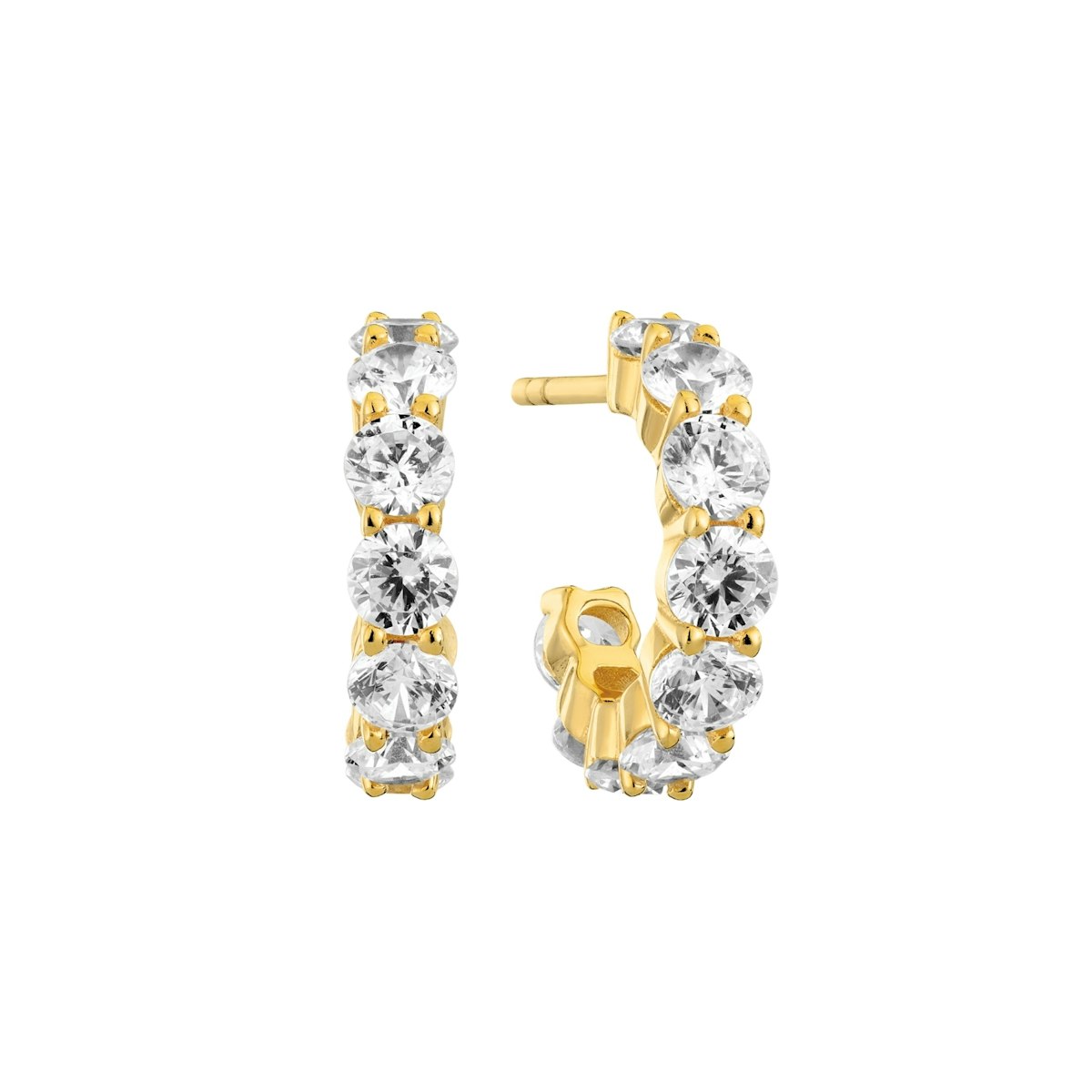 Ces élégantes boucles d'oreilles de Sif Jakobs sont créées en argent 925 plaqué or 18 carats et présentent une surface magnifiquement polie qui respire le luxe et la sophistication. Le zircon blanc facetté étincelant ajoute une touche exclusive et attire la lumière sous tous les angles, ce qui en fait un complément attrayant à toute collection de bijoux.