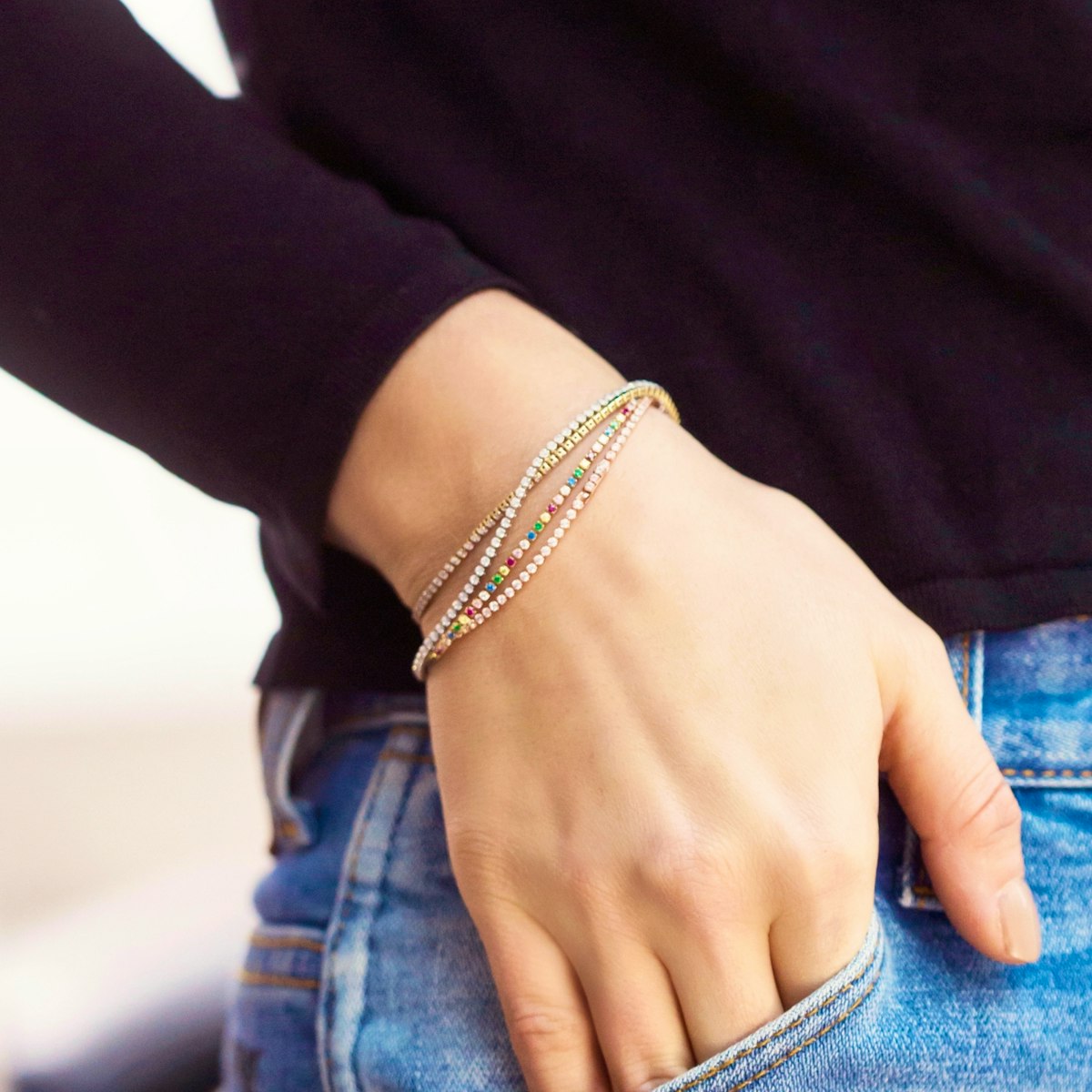 Armbåndet fås også i en rhodineret version af 925 sterlingsølv, der tilbyder en smuk, sølvfarvet finish, der er både moderne og sofistikeret. Begge versioner har en blankpoleret overflade og er smykket med de samme smukke, facetslebne hvide zirkoner.
