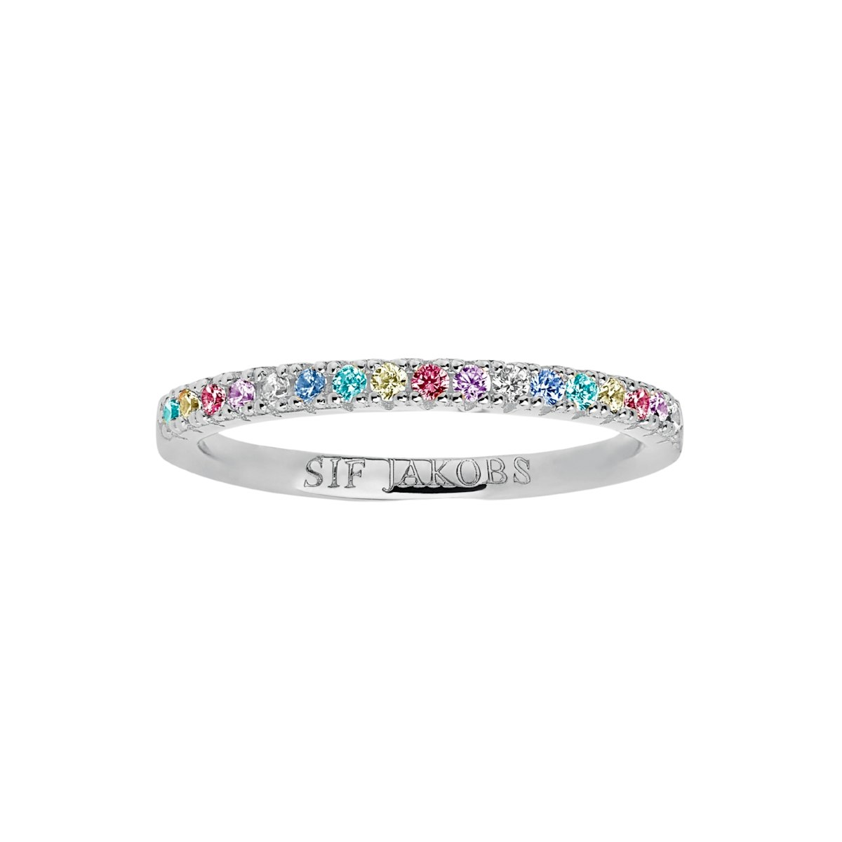 Ringen findes også med multifarvede, pink, grønne og blå zirkoner.